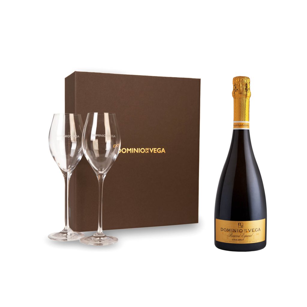 Un estuche de lujo donde podrás combinar nuestro cava de alta gama Reserva Especial con dos copas de cava de diseño con el logo de Dominio de la Vega.